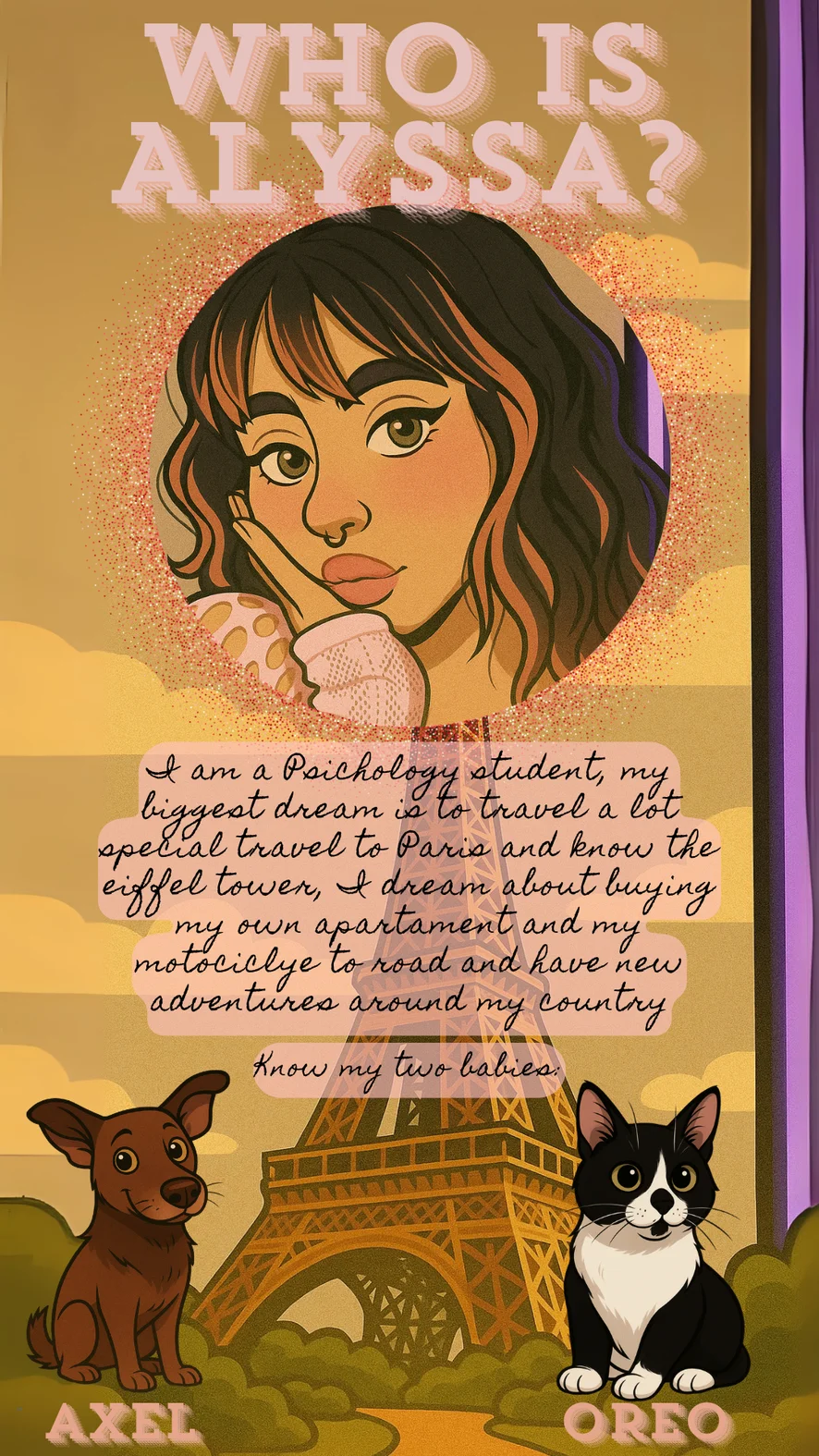 I am a Psichology student, my biggest dream is to travel a lot special travel to Paris and know the eiffel tower, I dream about buying my own apartament and my motociclye to road and have new adventures around my country