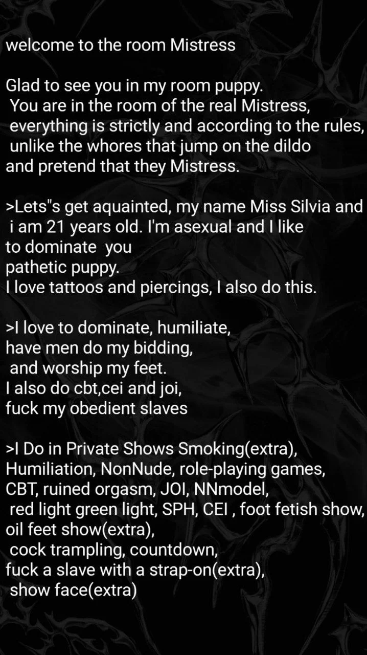 I Do in Private Shows: Smoking, Humiliation, NonNude, Role-playing games, CBT, Ruined orgasm, Dirty Talk, JOI, NNmodel, Red light green light, SPH, CEI , Foot fetish show, Oil feet show, Cock trampling ! for the stupid, I repeat: I NOT GET NAKED IN PRIVATE SHOWS, I ONLY SELL NAKED PHOTOS