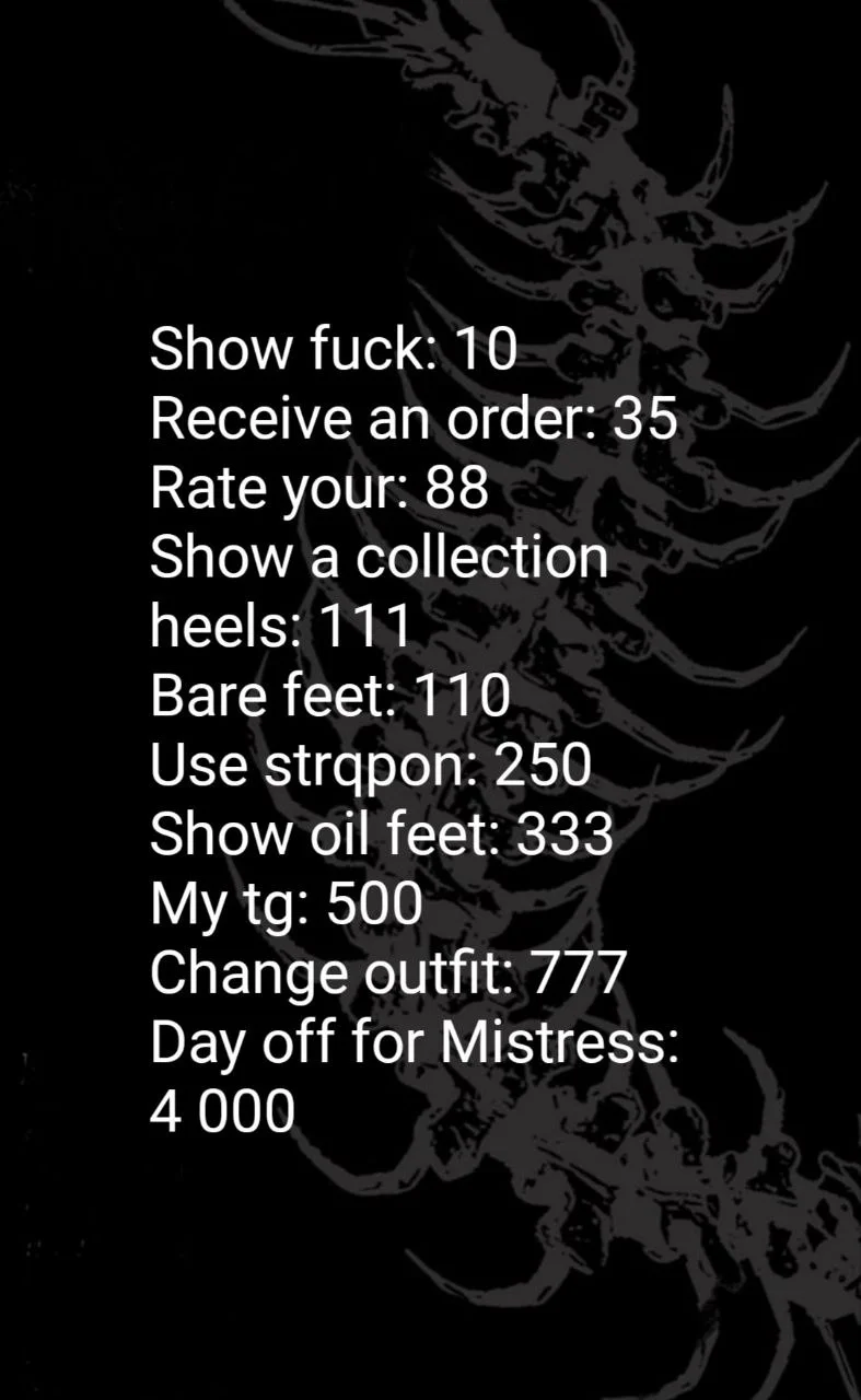 >Life story. Tell me your life story or fantasy. You can also find out my story. On request once a week. >I'll send a photo for you. I will send you my photo once a month upon request. The photo is at my discretion, but you can write about your desire, we’ll discuss it. >Action from tip menu. Once per month I will be able to replenish the action from my menu type upon request. >Foot fetish video. Upon request, I will send one video of my legs for you, as you wish, barefoot, in stockings or shoes. Let's discuss. On request once a week. >Date with me online! We will arrange a date with you once a month at your request. We will discuss the details and topic