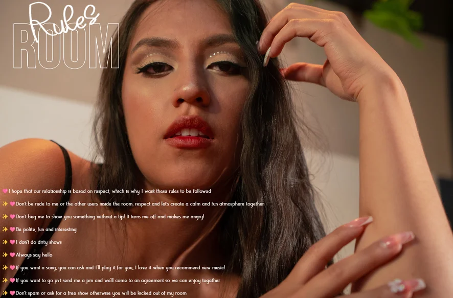 🩷I hope that our relationship is based on respect, which is why I want these rules to be followed: ✨🩷Don't be rude to me or the other users inside the room, respect and let's create a calm and fun atmosphere together ✨🩷Don't beg me to show you something without a tip! It turns me off and makes me angry! ✨🩷Be polite, fun and interesting ✨🩷I don't do dirty shows ✨🩷Always say hello ✨🩷If you want a song, you can ask and I'll play it for you, I love it when you recommend new music! ✨🩷If you want to go pvt send me a pm and we'll come to an agreement so we can enjoy together ✨🩷Don't spam or ask for a free show otherwise you will be kicked out of my room