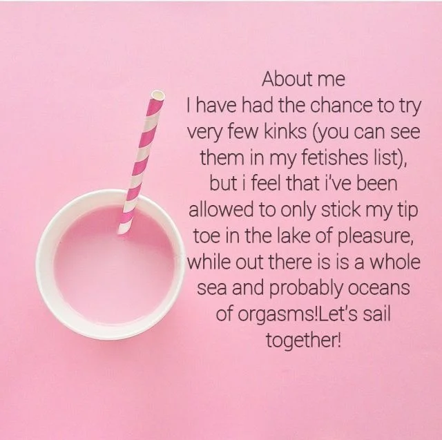 I have had the chance to try very few kinks (you can see them in my fetishes list), but i feel that i've been allowed to only stick my tip toe in the lake of pleasure, while out there is is a whole sea and probably oceans of orgasms!Let's sail together!